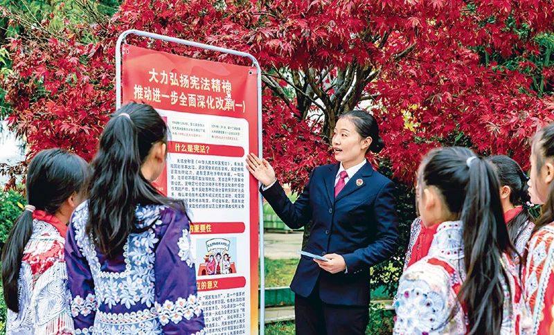 近年来,各地持续深化法治宣传教育,增强全民法治观念,助力法治中国建设。图为2024年12月3日,贵州省黔西市人民检察院干警在新仁苗族乡化竹小学为学生普及宪法知识。 新华社发 范晖/摄