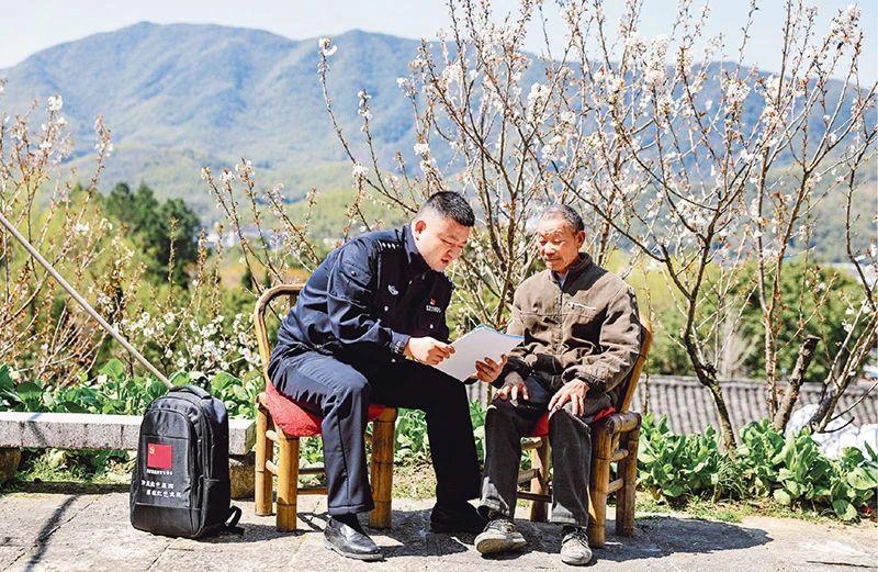 近年来,各地公安机关践行新时代“枫桥经验”,创新开展“背包警务”等工作模式,为基层群众排忧解难,推动矛盾纠纷化解。图为2025年3月21日,浙江省余姚市公安局梁弄派出所民警通过“背包警务”进村入户,开展安全防范宣传。 新华社记者 江汉/摄